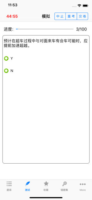 最新驾照理论考试题库,模拟考试场景。 功能介绍: 1.章节练习:汇集四大类,上千道最新题目 2.模拟考试:按照考试大纲中各章节所占比例全真模拟,自动生成题库 3.错题汇总:自动收录最近一次考试的错题,加强记忆 4.收藏夹:学习过程中和错题集回顾时有模糊的题目可随时一键收藏 4.交通标志:图文并茂,介绍各类交通标志