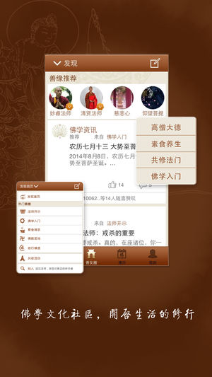 修行者,拥有健康身心灵,让生活更美好 中国身心灵健康移动互动平台! 特色功能介绍: 1、 上万首佛音免费下载 2、 最全的佛经分类,海量经书任您挑选 3、 结缘千万佛友,法师在线开示 4、 佛诞,斋日等提醒,最全的佛历 【生活就是一场修行】 生活的每一天都是修行,不仅是礼佛,烧香,念经,更多的祈望我们一起学会生活的修行,例如:孝敬父母、锻炼身体、精神减压、家庭和睦、邻里融洽、互助友爱、关爱生命、获取工作智慧、社会和谐等,将正宗佛家的智慧与文化融合在生活当中,传播人间佛教的善因,开启般若智慧,从而让人们学会放松、学会有节奏的工作,更学会彼此尊重、珍惜、感恩,和广大朋友们一起建立一个身心灵…