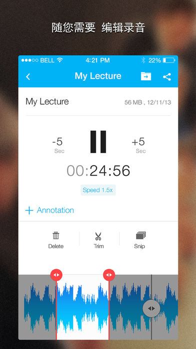 Recordium是一个专为iPhone, iPad, 和iPod Touch设计的功能强大,界面美观的录音软件。Recordium让你在播放或录制音频的同时标记重点部分,帮助你将注意力集中在录音中最重要的部分上。 Recordium拥有直观的使用界面,流畅的录音回放,用户可以通过各种压缩算法来自定义录音的大小和质量。这些特殊的功能使Recordium成为了人人手中必备的工具,尤其是学生,新闻记者,和音乐人。 Recordium, 看见你所听见! 迷你简易录音功能: *****标记录音中的重点部分***** 在录制或回放的同时标记一段音频中的重要部分。 轻松地在可触控的波形图上编辑重点部分 ***兼容苹果耳机和EarPods。*** 当正在录音或播放时,可以利用Earpod或耳机来标记重要部份。你可以快速按动中间的按钮两次来开始或结束标记重要部份。 我们已经开发出一种很特别的功能,重新塑造Earpod的用途,并推出一种新方法来使用这个小工具。 **高质量录音** 3种可调节的采样率(8, 22, 44.1 kHz)来定义录音的大小和质量。 4种不同的录音格式:WAV,CAF,AIFF,MP4. 特殊的MP4压缩格式:(比如将一小时的录音压缩到小于30MB。) **强大的录音** 后台录音和回放。 录音时暂停。 中断保护让你在录音中途接完电话后继续录音。 录音无时间限制,想录多久都可以。 自动保存让你不会丢失任何录音。 增强的录音音量让你更好地捕捉远距离的声音。 自动暂停功能可以跳过对话间隔来降低文件大小。 **强大的文件共享** 将你的录音上传到Dropbox, Google Drive, Evernote和其他云应用软件。 直接从Recordium将你的录音以邮件形式发出。 通过无线同步将你的录音传输到电脑上。 iTunes文件共享。 **iCloud同步** 你可以在你的iPhone或iPad上轻松存取你的所有录音。 **文件管理** 通过标题 搜索文件。 迅速从文件列表中播放录音。 便捷的文件和文件夹管理系统。 在录音和回放过程中修改文件和文件夹名。 增加,删除,移动,以及重命名你的录音文件。 详尽的录音信息显示,包括大小,长短,和日期。 **导入多种格式** 可导入的音频格式包括:MP3、MP4、WAV、AIFF和CAF,并使用iTunes文件共享。 **导出简易录音的录音档案** 导出附有注释的录音档案,可以在任何地方播放,并且可以在简易录音应用程序内编辑。 **回放** 高敏感度的波形图。 放大,缩小,通过可触控的波形图进行可视化控制。 不同的回放速度以及可进行修改的音调。 可选择5秒、10秒、15秒或20秒的快进或倒带。 我们一直在努力改进这个应用程序,所以请继续向我们发送你的意见。我们希望你喜欢使用简易录音,就像我们喜欢这方面的工作一样。谢谢你的支持。