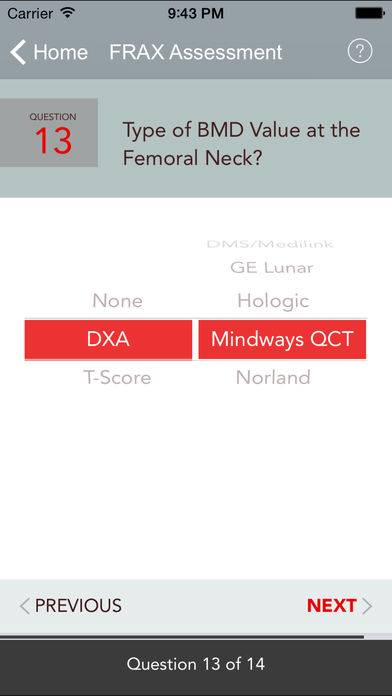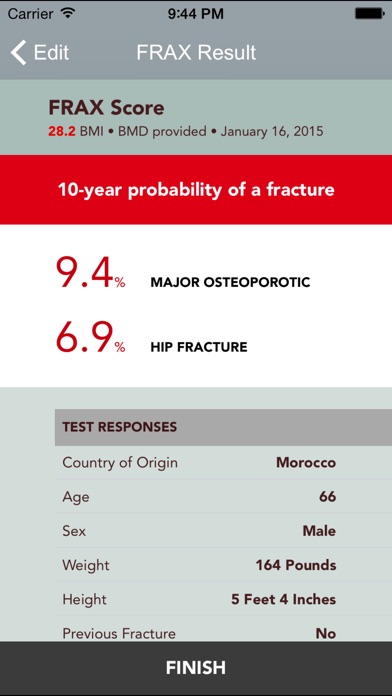 The Fracture Risk Assessment Tool (FRAX®) offers the medical practitioner an easy-to-use tool to calculate an individual patient’s 10-year probability of an osteoporotic fracture. Osteoporosis management guidelines around the world now increasingly recommend that fracture risk assessment be part of any clinical evaluation to help inform treatment decisions. This App makes FRAX calculations handily available via smartphone or tablet – for maximum flexibility in any clinical setting. FRAX generates the following results: - the 10-year probability of a major osteoporotic event (clinical spine, forearm, hip or shoulder fracture). - the 10-year probability of a hip fracture - Body Mass Index Models are available for the following countries/population groups: Argentina, Armenia, Australia, Austria, Belgium, Brazil, Canada, Chile, China, Colombia, Croatia, Czech Republic, Denmark, Ecuador, Estonia, Finland, France, Germany, Greece, Hong Kong, Hungary, Iceland, India, Indonesia, Ireland, Israel, Italy, Japan, Jordan, Kuwait, Lebanon, Lithuania, Malta, Mexico, Morocco, Netherlands, New Zealand, Norway, Palestine, Philippines, Poland, Portugal, Romania, Russia, Singapore-Chinese, Singapore-Indians, Singapore-Malays, Slovakia, South Korea, Spain, Sri Lanka, Sweden, Switzerland, Taiwan, Thailand, Tunisia, Turkey, UK, US-Asian, US- Black, US-Caucasian, US-Hispanic, Venezuela For UK users, NOGG guidance is accessible. This provides a guide for assessors, interpreting the results and indicating potential courses of action. FRAX updates on your App: Updates will be provided as new and/or updated country models become available. Language options will be added gradually in the coming year. FRAX App functionality: - PIN Protection for saved assessments - Patient Results Management (save, delete & sort options) - E-mail sharing capability of patient assessment (responses and results) - Shake-to-Restart assessment functionality All proceeds from the FRAX App go to the International Osteoporosis Foundation (IOF), which helps develop and maintain the FRAX tool.
