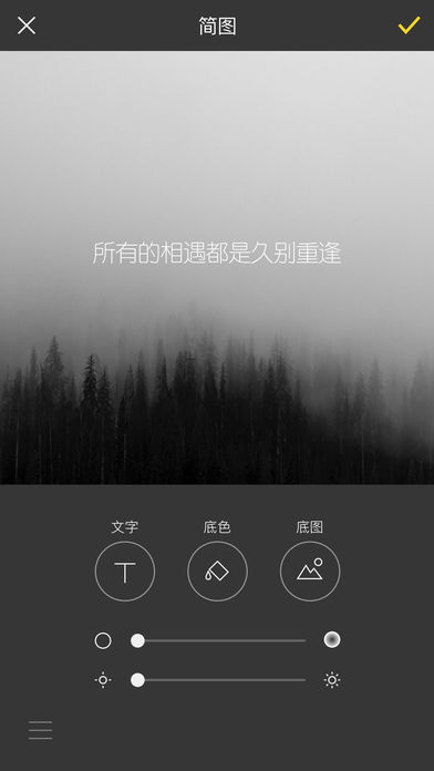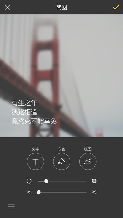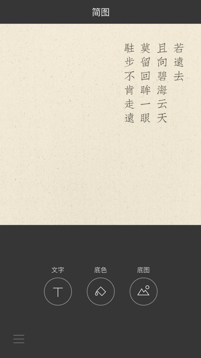 写字,配图,分享到微信和微博。 只需 3 步,你就能用「简图」创作自己的方块图文并分享到微信和微博: · 全屏无干扰的书写文字,搭配最能契合心境的字体 · 从预置的颜色和纹理中选择喜欢的作为文字的背景;或者,用相机拍摄或从相册里选择自己心仪的图片作为配图,还能够拖动滑杆对图片进行「模糊」及「变暗」处理 · 一键将方块图文分享到微信和微博去收获更多的赞和评论。当然,你还可以将它保存里相册里私藏 这就开始创作「简图」与你的朋友们分享吧!