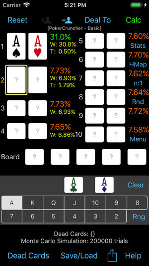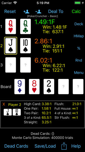 A simple, flexible, and easy-to-use Texas Hold'em odds calculator. (The *Basic* version of PokerCruncher.) *** Pay once and enjoy forever *** No in-app purchases/fees. Continual improvement for many years. *** Tutorial and videos on our website *** PokerCruncher-Basic supports up to 10 players an…