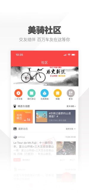 美骑-汇聚了自行车资讯、产品、车店、视频、广告、车友圈、路线库和美骑易购商城等功能。为车友提供从选车、购车、骑行活动、旅行、自行车赛事、美骑保险等一站式骑行服务。 **主要功能** 1.【骑行资讯】将多得数不清的自行车资讯放在口袋里,骑闻、评测、赛事......应有尽有。 2.【车友圈】无车友,不骑行,骑记共分享!六十万骑行爱好者互动圈子让您从不孤单; 3.【车店库】GPS定位附近车店,找车修车服务倍儿贴心,发现您心目中的星级车店; 4.【美骑保险】骑行保险一键购买,24小时在线,5分钟获得保单,日均只需6毛6,小投入,大安心; 5.【产品库】专业指导,选车购车,全程帮您解决各种疑惑; 6.…