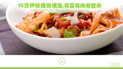 15分钟做便当,有菜有肉有营养。教你使用最容易处理的食材,最简单快速的做法,营养美味,轻松搞定。凤凰卫视强烈推荐,都市白领疯狂热捧! “15分钟自制快捷营养便当”每样食材在菜市场、超市都能买到!所选主料只要用水一冲就干净,清洗极其容易!配料超级简单,大部分只用油、盐就能搞定!不需要刀工、不考验厨艺!厨具一点不复杂,普通炒锅就能做出绝佳美味! 花椒鸡丁+清炒素四色+梨、土豆腊肠焖饭+香烧古日萝卜+素鲜汤、蔬菜牛肉丁+苦瓜拌木耳+圣女果、香浓意大利面+甜玉米沙拉、红薯百合炒鸡丁+手撕包菜、白萝卜烧牛肉+海带炖豆腐+双椒炒腊八豆、双丝热拌羊肉+蒜蓉茄子。。。。。。香味四溢、菜色诱人、口水欲滴的便当,最快12分钟、最慢23分钟,平均15分钟就能搞定! “15分钟自制快捷营养便当”,远离地沟油、远离苏丹红,既省钱又健康美味,让你既能满足自己的胃口又不亏待自己的钱包。“15分钟自制快捷营养便当”,早上起床后准备也完全来得及!让你既能多睡会,又能吃上可口又卫生的饭菜。 春天的元气便当、夏天的轻食便当、秋天的滋补便当、冬天的恋日便当、孩子的爱心便当、旅游的活力便当,一年四季都健康! 【应用特色】 按照“春生”、“夏长”、“秋收”、“冬藏”的养生原则,分春吃鲜、夏清热、秋润燥、冬温补四个部分推出多达57款营养美味便当。 近百张漂亮高清美图 最新最炫的富媒体交互阅读体验 【用户好评】 每份便当都五颜六色的,看起来很健康,食材也都是市面上常见的材料,做起来应该也不难,工作很辛苦,一定要好好善待自己的胃和午休的时光。 ----郭伯钊 材料好买,做法简单,统筹好时间的话,15分钟差不多确实能做好一套便当,荤素搭配合理,总之,非常不错。 ----刘丽娜 附近的餐馆吃来吃去就那几样,没什么花样,而且安全性也令人怀疑,所以,看到这本便当书,就忍不住买了回来。 -----韩冬生 【关于我们】 应用航母是一个无需编程、专业快速开发移动应用的云平台,将传统的信息、书籍、出版资源等转换为具有游戏手法、电影手法、多媒体的新一代4D交互应用。我们的理念是“非酷不能读”,致力于为广大朋友提供更多更好的新一代精品应用! PS:在搜索框里面输入xxt可以检索到应用航母(AppCarrier)的所有产品。 【欢迎联系】 邮箱:appcarrier@126.com 微博:http://weibo.com/yidongshuyouhui