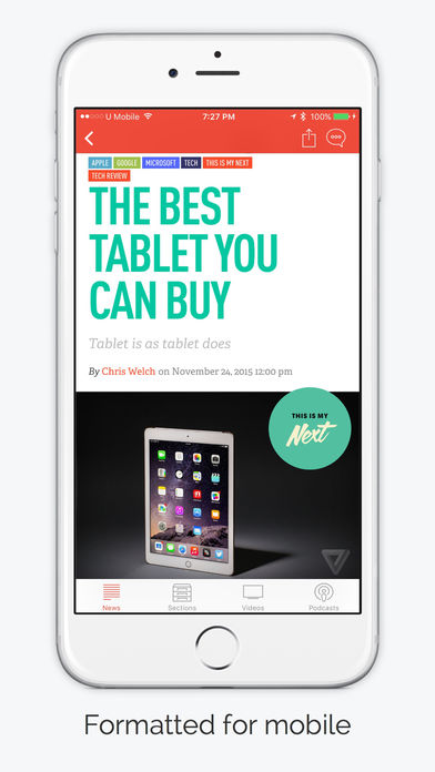 Get the latest breaking news and tech coverage by The Verge, in a new refreshed user interface. This app is an unofficial client that gets you the all the content you known and loved from The Verge, wrapped inside an iOS7 inspired design that allows you to browse through articles with ease. KEY FEATURES: • Get the latest in consumer technology news, reviews, features, and exclusives as they unfold. • Offline Reading - Activate airplane mode to read without using your cellular data! • Watch “On The Verge,” “The Vergecast,” “The Verge Mobile Show,” and more without ever leaving the app. • Browse the latest photo galleries, featuring the full range of gadgets, software, and events covered on The Verge. • Listen to “The Vergecast” and “The Verge Mobile Show” as you read the latest in tech news or minimize the player and listen while you do other things. • Share news and stories with your friends via Facebook, Twitter, and email. • Comment on articles and features and be part of the conversation in realtime.