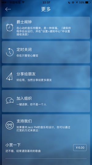 这是一个jazz迷们的专属app,本应用已荣获 ==爵士与黑胶专题推荐== ==爱范儿AppSo&MindStore联合推荐== ==36Kr Next上榜产品== 在这里,只有纯粹的jazz音乐,你只需要打开这个app,插上耳机,静静享受这大好的jazz时光。 遇到心动的歌曲还可以放到收藏夹 开心的时候 我听jazz 难过的时候 我听jazz 愤怒的时候 我听jazz 喝咖啡的时候 我听jazz 抽烟的时候 我听jazz 坐在窗前 我听jazz 躺在湖边 我听jazz 我只是想听jazz 我只是要听jazz 我的生命已经离不开 jazz 打开这个app之后 你只需要 带上耳机 闭上…
