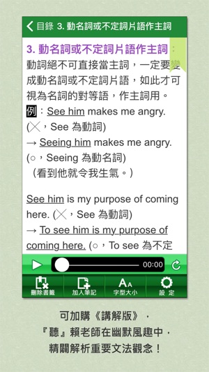 ***** 【經典級文法書】文法重點條例化,解說清晰易懂***** 您上過英文補教名師-賴世雄老師的文法課嗎?如果您未能恭逢賴老師堂堂爆滿的精彩課程,那絕對不能錯過這套《賴世雄英文文法》課程。 ***** App內包含《賴世雄英文文法》全書1-14章的文字內容與第1章的語音講解,第2章以後的語音講解必須在App內加購與下載!***** 《賴世雄英文文法》全書1-14章,以淺顯易懂的文字解說,帶您一路輕鬆掌握學習文法的樂趣,成為人人稱羨的英文高手!如果您想進一步加強印象,可以加購《講解版》,聽賴老師在風趣幽默中,漫談重要文法觀念,用最淺顯易懂的教學方式,讓讀者用耳朵聽,也能輕鬆領略英…