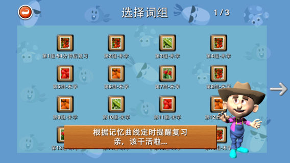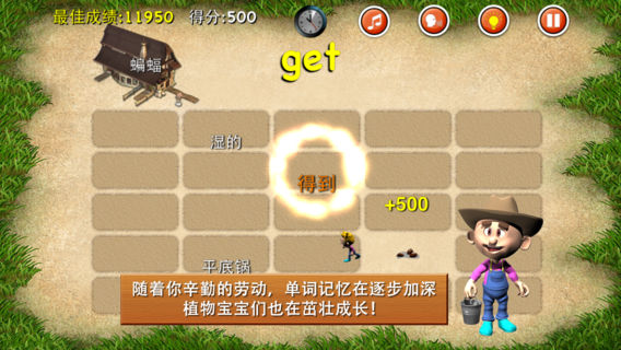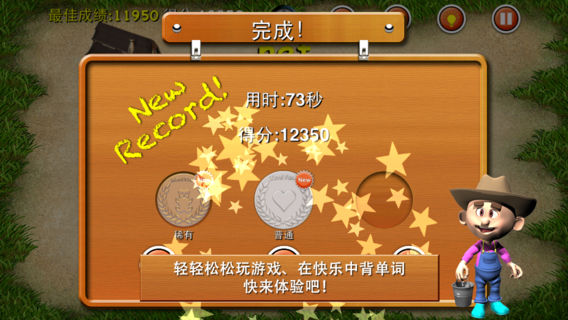 2012年11月6日单词农场-获App Store新品推荐第一名!我们将全力改进产品,为您奉上最佳的学习体验,敬请期待! 单词农场-把枯燥乏味的背单词过程改造为种菜游戏,让你在轻松愉快的游戏中记住单词! 亲,不知您发现没,单词的记忆过程和种菜的过程多么相似啊 从最初的开荒(初记)、播种(强化记忆),浇水(首次复习),施肥(第二次复习),松土(第三次复习),除草(第四次复习),杀虫(第五次复习),一直到最后收获果实(最终复习) 随着你辛勤的劳动(复习),单词记忆在逐步加深,植物宝宝们也在茁壮成长 等到收获的时节,你会发现在不知不觉中已经记住那些看起来很难的单词啦 来体验真正的寓教于乐吧,轻轻松松玩游戏,在快乐中背单词 主要特点 1,首创背单词+种菜游戏模式,将枯燥乏味的重复记忆,改变为轻松愉快的游戏体验 2,全程离线词库 3,超过16000个离线单词语音 4,涵盖小学、初中、高中、四六级、考研、雅思、托福等常用词库 5,根据记忆曲线定时提醒复习,亲,该干活啦… 6,独特的金币奖励机制,为你的辛勤劳动加油! 7,界面直观、操作简单、轻松上手