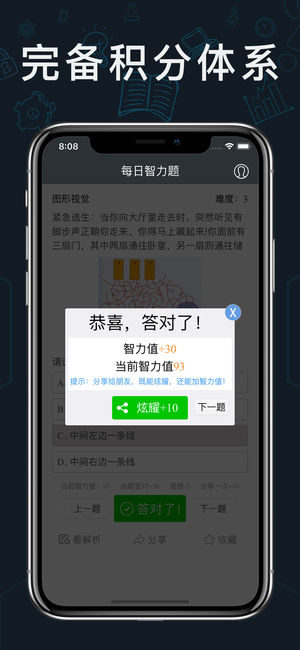 "冲击头脑王者,答题多赚钱?先来一波赛前练习吧,各种奇怪知识尽在每日智力题! 完美适配iOS11和iPhone X。 经典无尽答题模式,海量题目,题库持续更新中; 分类齐全,侦探推理、逻辑、谜题、脑筋急转弯、数学、图形几何……各种智力题,尽享头脑风暴的乐趣~ 题目解析、答题分享、错题收藏,帮你不断提升智力、提高游戏水平~ 签到、分享送经验,积分模式玩不停! 看看谁才是史上最强智力达人?赶快来挑战一下吧!"