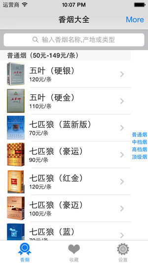 《香烟百科大全》图文并茂的列出了数千种品牌的香烟。 《香烟百科大全》具有强大的检索功能,输入名称、品牌或是产地都可以进行检索。 《香烟百科大全》详细列出了每种香烟的图片,品牌,规格,产地,条码信息,生产厂商以及参考价格等。 《香烟百科大全》为您挑选香烟提供参考。