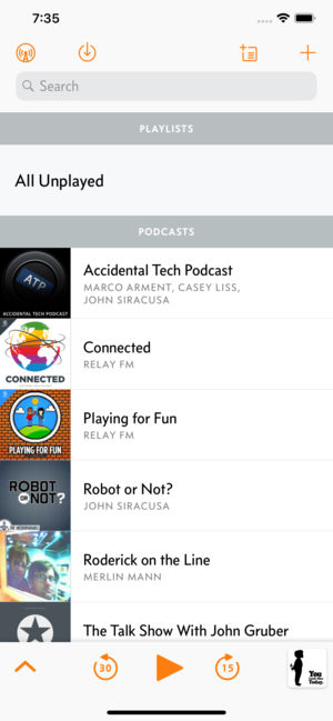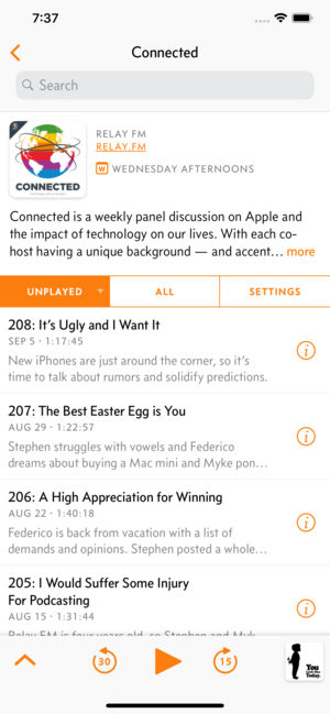 A powerful yet simple podcast player, with Smart Speed, Voice Boost, and Smart Playlists to help you listen to more podcasts in more places, try new shows, and completely control your experience. Overcast is a modern, fully featured audio podcast player with many useful features in a simple, intuit…