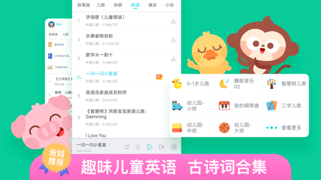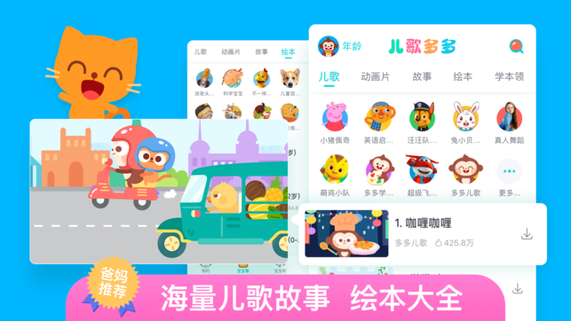 【儿歌多多】 精彩儿歌故事、动画绘本、儿童课件、早教童谣⋯⋯更多优选内容给孩子一个快乐的童年。 ▲ 主要功能 【宝宝看】 儿歌多多原创的精选儿歌故事,更有成语寓言,绘本动画及早教英语等内容,深受家长和小朋友们的喜爱。 【宝宝听】 热门好听的儿歌故事、唐诗宋词、散文小说等,贴心精选适合0至12岁不同年龄段收听的内容,高清好音质更适合家长和小朋友们。 【宝宝学】 专注早教启蒙,涵盖颜色、形状、数字、文字等多个知识体系,通过不同的场景和故事来激发小朋友们探索学习的兴趣,快快乐乐做游戏,轻轻松松学本领。 丰富的视听内容,有趣互动小游戏。 边听边看,边学边玩,轻松学本领。 情节合理,反复巩固,加…