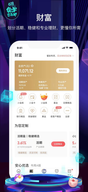 【单单返奖金!全民抢免单!最高返1万 】 • 5.24-6.20 下单就返,每单都有回头钱! • 20:00 狂欢摇免单,更有8,888元立减券、888,888体验金拼好运! • 天天白条12期免息,¥0.01超值券包不停送! 这个618,京东金融用奖金!犒!赏!你! 京东金融App,生活总有小甜头—— 在这里,您可以轻松解决和“钱”相关的问题:【安心赚钱】【任性花钱】【轻松借钱】【支付省钱】【畅快谈钱】,更有小白理财、保险、签到、早起打卡、等贴心服务。 【安心赚钱】 活期小金库,灵活存取,大额转入极速到账。 定期、基金、股票、黄金,品类齐全,灵活稳健。 独有“基智账户”,为您提供科学专业…