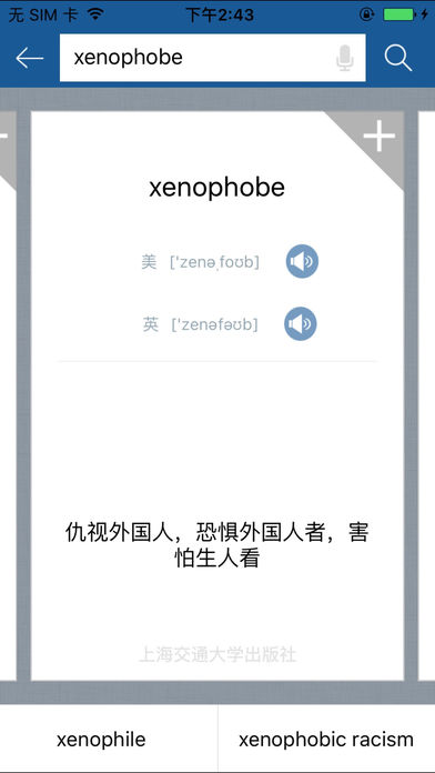 时代性很强的专业英汉法律词典,《英汉双向法律词典》2001年11月第1版发行,手机版与2011年2月第2版同步。内容涵盖了法学的各个领域,但对国际金融贸易类又有所侧重,同时,又及时吸收了大量新词汇,还吸收了一般法律词典没有吸收的词汇,如法律文献中经常使用的拉丁语词汇,共收词条近5万条。海词词典(中国第一个在线词典dict.cn)携手上海交通大学出版社官方权威正版发布,具备手机上最便捷的查词功能(摄像头查词、语音查词、通知栏快捷查词等),还有清晰发音、生词收藏、生词辅助记忆等学习功能。选择高品质词典和词汇手册,学习更有保障!(版权所有,盗版必究) 包含应用内购买,购买后畅享正版内容,无每日使用次数限制。 【软件特色】 (1)权威正版:本手册是上海交通大学出版社发行的本行业最权威词典。 (2)专业精选:收录法律专业词汇50000余条。 (3)快捷查词:支持多种查词方式“摄像头查词、语音查词、通知栏快捷查词”等。 (4)英/美发音:与书籍相比,增加了多媒体英式和美式发音,所有单词皆可发音。 (5)离线查询:下载安装离线包后,在无网络情况下,一样可以查词、发音,无需GPRS流量。 (6)云生词本:采用云端同步技术,为用户提供生词同步学习服务,可以随时随地收藏和复习生词。 (7)背单词:软件具有生词复习计划制定功能,以及根据艾宾浩斯记忆曲线自动提醒背诵功能,快速轻松掌握行业词汇。