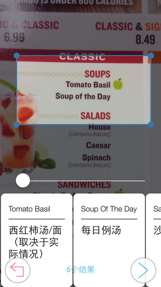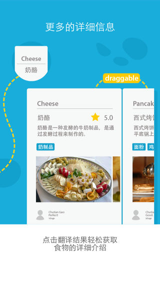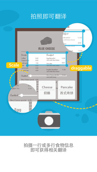 领先的实景菜单翻译应用:支持菜单多行扫描翻译,点击结果查看图文解释和评论 ***获苹果应用商店 “优秀新App”官方推荐*** 产品特色: 1,菜单翻译超方便,轻轻一拍多行食物描述即刻翻译 2,多国美食一秒懂,点开词条阅读图文介绍立马知晓 3,看看大伙怎么说,食物评论助您发掘最爱异国美味 4,世界美食鉴赏家,立搜中英菜名变身西餐洋酒行家 蓝芝士的初衷:陪她尝遍全世界的美味 咱创始君小豪童鞋大一追了同班的台湾小姑凉。他们第一次约会的时候去了一家意大利餐厅(美国的饮食真是各国大杂烩)。俩人瞪着菜谱上的各种生僻菜名毫无头绪。妹子就问小豪童鞋肿么办,小豪君为了不丢人就硬着头皮帮妹子点了一份烤莴苣沙拉配蓝芝士酱(Grilled Romaine Salad with Blue Cheese)。因为菜单上就这个菜名能看懂了,而且蓝芝士神马的听起来也高大上嘛。但是万万妹想到蓝芝士竟然是一种由青霉菌发酵而成的重口味奶酪,让妹纸吃得很不开心,吃货小豪君于是发誓说一定要陪她尝遍全世界的美味!虽然后来姑凉早已离开,但小豪君一直牢牢记着蓝芝士的承诺。于是他感召了几位呆萌工程狮,在数次创业比赛中打动美国评委并攒下初始资金。最后大家一起用绳命打造了这么一款美食神器,希望能陪着她以及其他在海外旅行的小伙伴们点到最爱的美食。之前的那个承诺,也就变成了这么一款神器,并获得AppStore中国区的“优秀新app”推荐,希望那位台湾姑凉能够看到。 想要了解创始君小豪的更多囧事吗:) 欢迎关注我们的微信订阅号和新浪微博:美食冒险家 邮箱:ceo@1keji.com 了解全世界最美味和最奇怪的食物