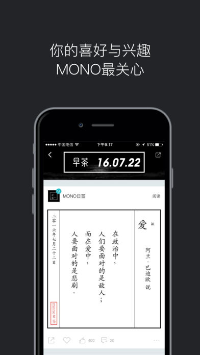 MONO是一个关心你的喜好与兴趣的内容订阅平台。 你可以在MONO关注你感兴趣的主题站,我们基于你的兴趣挖掘优质内容,帮助你有效率地获取你所关心领域的最新消息。 你会因为这些喜欢MONO: - MONO包含了丰富的主题,以及全网最优质的内容生产者 - 关注你感兴趣的主题站和造物主,在内容更新时MONO会第一时间通过推送告诉你。 - 每一篇主题的更新,从文字到视频,从画册到音乐,无不精挑细选 - 自由设定主题站内容更新的推送,轻松把握自己关心的优质信息 - 在MONO你可以和有相同兴趣的人做朋友 如果你有想看的主题,但是MONO还没有,请在APP内告诉我们。 任何bug、闪退问题,建议和吐槽请直接在APP内与客服联系,或发邮件到feedback@mmmono.com,我们在意大家的每一条反馈。 如果你想成为MONO造物主,和大家分享你的见识和生活,也请联系我们cp@mmmono.com
