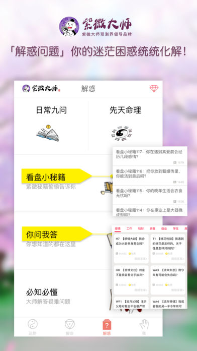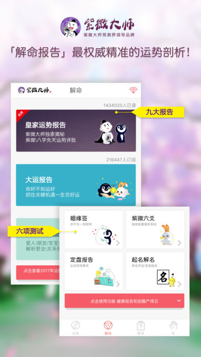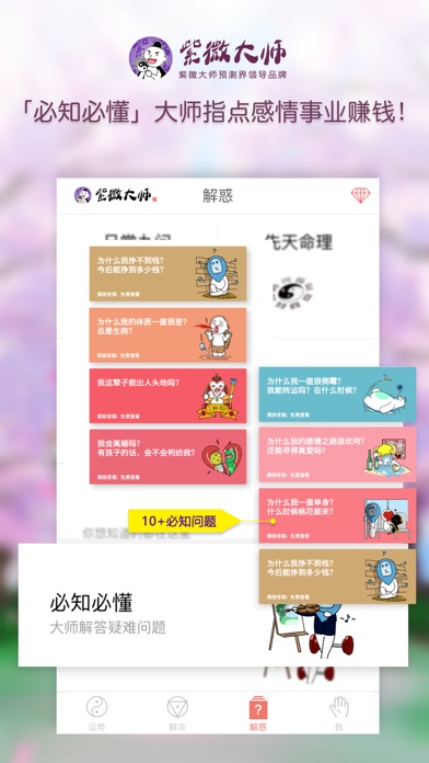 不是所有人都有幸遇到紫微大师指点 每一秒一个用户加持中.....你是下一个幸运儿? 紫微大师互联网预测领导品牌! ⊙同类应用唯一100000+的粉丝五星好评 ⊙全球紫微斗数APP论算命理排名第一 ⊙学习紫微斗数第一必备工具 ⊙鼻祖传人30年首次公开单传秘笈算法命运走势 ⊙大数据时代500万科学统计验证准确率100% ⊙宝典级婚恋、职场、商场、创富攻心神术 ⊙100多个问题解盘人生百态事强大自我助梦成功 ⊙铁断结婚、离婚、小三、创业、升迁、暴富、怀孕年份 ⊙帮您30岁前知天命带着棋谱下棋绝杀 (温馨说明:紫微大师由于过于精准,心理承受弱的用户谨慎使用。每日的能量状况是建立在月的能量基础上建议同时参考,不要仅仅受流日负能量暴强的影响产生负面心理。) APP问题解析汇总 【先天格局】 我的先天格局是怎样的? 先天格局建议 我先天精神喜好是什么? 我的一生会因为什么执着? 我会因为什么事情困扰一生?如何调整化解? 一生影响我的负能量是什么?我该怎样获得正能量来排解负能量? 先天总体能量强弱如何?(了解自身格局高低、顺境与逆境的占比) 【大运走势】 年龄大的人都会后悔年轻时错过太多机会,人一生的成功取决于是否能抓住为数不多的几次机会,独家透露让你提前做好准备抓机会? 一生中为数不多的能量爆发的年份,独家透露让你提前做好准备让人生更加精彩? 独家透露你的大运走势,能量强弱时间阶段一目了然,掌握命运,决策人生? 独家透露你的一生顺利好年份? 独家透露你的一生最差的年份?方便提前心理预防 【爱情婚姻】 我会有怎样的爱情?我的另一半是什么样的? 我感情婚姻状况先天是怎样的? 遇到感情问题,我要怎么化解? 我什么时间能恋爱?什么时间能结婚? 我先天有离婚的负能量干扰吗?会在什么时间格外注意? 我的另一半会有外遇吗?如果有会在什么时候? 我会不会成为第三者? 我会成为大龄单身男女吗? 我会劈腿吗? 【事业发展】 我先天的事业工作是怎样的? 我的事业历程里是否会经历挫折? 我是否适合创业?什么时候创业最合适? 我的事业会做到怎样的格局高度? 我适合和别人一起做生意吗? 我一生的事业运势走向如何,独家揭露能量周期帮你顺势而为事业有成? 我适合做哪些行业工作? 我有没有读书的天赋? 【财富创富】 我先天的赚钱的途径是怎样的? 我先天的财富能量状况如何? 我有机会成为土豪吗? 我会不会暴富?如果有在什么时候? 我的第一桶金什么时候可以得到? 哪些年我财运的能量比较强,容易赚到钱? 什么样的人助我赚钱? 我能有自己的房子吗? 我住在什么环境容易提升运势? 【桃花子女】 我容易怀孕吗?(仅女性) 我会在哪年生宝宝的能量最强(帮助父母提前准备怀上宝宝)? 我会有怎样的儿女? 我遇到的桃花是怎样的,关于性是怎样对待的? 【身体体质】 我身体先天状况是怎样的? 我会是癌症体质吗?如果有在什么时间需要格外注意预防? 【人际交往】 遇到困难会不会有贵人相助,贵人是什么样的? 我会不会经常遇到小人? 当我遇到困难借钱,哪种人会雪中送炭? 【爱情婚姻】 今年的异性缘能量指数如何? 今年什么时候与伴侣培养感情或找到(男)女朋友的能量高? 今天适合约会吗? 今天适合跟异性表白吗? 今年有可能会失恋么?几月份感情发生变故的指数高? 我或者另一半今年有可能移情别恋吗? 今年会不会成为第三者? 今年会有桃花劫么? 我在今年什么时候适合求婚? 今天适合去相亲吗? 哪几个属相与我姻缘运最旺,配对成功的概率最高? 【工作事业】 今年是否适合创业?如果适合相对而言那些月份最高? 今年会有升迁的机会吗?如果有在什么时候? 我今年若创业适合与他人合伙吗? 今年找工作会不会找到合适满意的工作? 今年在什么时候找到工作的几率高?或者什么时候开展事业会更顺利? 我今年能不能升官(政府部门)?在哪几个月会升? 我今年会遇到贵人吗? 我今年考上公务员的概率高吗? 我今年的事业上会惹上官司吗? 今天我适不适合面试? 今天会遇见贵人吗? 今天我能成功签合同吗? 今天我适合出差办事吗? 公司今年适不适合大力做广告推广? 今年适不适合投资或扩大事业规模? 【赚钱置产】 我本月赚钱机会多么? 我今天会不会有赚钱的机会? 我今天会不会有现金进账? 我本月会不会有很大的开销?现金流会紧张吗? 我今年到年底能攒下钱吗? 我今年现金流周转状况怎么样? 我今年股票上会不会赚钱? 我今日股票投资买进卖出能量指数? 我今年买车的能量强吗?买的车是怎样的? 今年若买车,什么时间我最可能买到适宜的车? 若今年卖车哪几个月更容易卖掉? 我今年有可能买到房子吗? 若要买房,今年我什么时间买房会买到满意的房子? 我今年什么时候搬家的能量最强? 若我房子遇到拆迁问题,今年会不会被拆掉? 若需要卖房,我今年什么时间把房子卖掉的可能性最高? 今年适不适合把房子出手掉? 今年适不适合投资房产?如何操作? 【学业】 我今年考上大学的可能性高吗? 今年适不适合学门技能? 我今年的考试顺利吗? 我今年适合去再深造吗? 我本月考试是否顺利? 我今天的考试能量指数如何? 【择日】 近一年内最适合谈婚论嫁(父母,谈婚事,领证结婚,办酒席,度蜜月)的月份有哪些? 6个月内订婚领证结婚宴请日?(独家能量算法可以降低婚后第三者、挫折、分离的负能量干扰) 最近3个月哪天最适合乔迁?