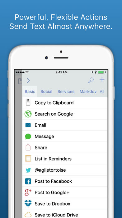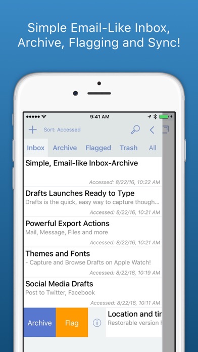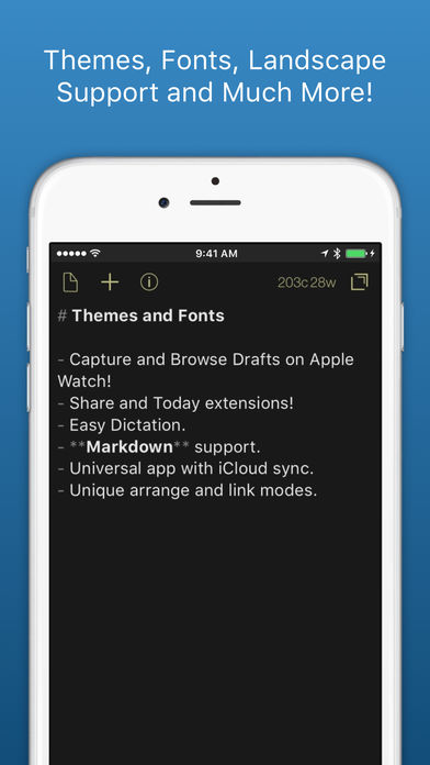 Drafts, where text starts. Quickly capture text and send it almost anywhere! New low price, Great new iOS 10 features!!! #### iOS 10 ready with Messages app, Dictation and more! #### Macworld, Eddy Award Winner, 5 Mice! #### Lifehacker Pack for iPhone/iPad #### “Easily one of the best iOS apps I’ve ever used.” – Merlin Mann #### See drafts in action at agiletortoise.com/screencasts Drafts is the quick, easy way to capture and share text. In Drafts, text comes first – open the app and get a new, blank draft – ready to type. Don't get bogged down in a timeline to tweet or post to Facebook. Don't tap your way through multiple screens to get down an email or SMS. Don't navigate folders, create files and name them just to jot down a note or create a todo. Extensive output options let you send text to Twitter, Facebook, Mail, Message, a Calendar event, quickly save (or prepend/append) to Dropbox, Google Drive or Evernote and much more. Advanced multi-step actions and Javascript integration can combine all of these options in a single tap and more. Drafts can make any workflow shine! ## LATEST iOS 10 & DEVICE SUPPORT * Message app to insert text snippets from drafts. * Quick dictation. * iPad Multitasking + Keyboard Shortcut Bar support. * Spotlight search indexing of inbox drafts, with search continuation support. * Widget, Share extensions & 3D Touch support. * Apple Watch app to capture and browse drafts. ## EDITING & STORAGE * Simple, distraction-free editing environment supports landscape editing. * Light, Dark and Sepia themes. * Support use of any font installed the device for editing. * Unique Arrange feature lets you reorder lines by drag and drop. * Markdown and Social syntax highlighting modes. * Universal app syncs across your devices using Apple's new CloudKit. * Version histories for drafts allow you to browse and rollback to previous versions. * Optionally track creation, modification location data for your drafts. * Fully customizable extended keyboard row, with support for simple text snippets and Javascript-based keys make everything from quick entry to powerful string manipulation with Regular Expression possible. Find and install ready to use keys in our directory! * Search full text. * Word and character counts. * Link mode makes phones numbers, emails, links and address you have captured into tappable links. ## ACTIONS * Integrates with system services to send text, including Mail, Messages, Calendar, Reminders and more. * Post to Twitter, Facebook, Path. Drafts is the best place to keep those status updates you are still working on, or to cross-post to multiple social sites. * Create, Append and Prepend to files/notes in iCloud Drive, Dropbox, Box.com, OneDrive, Google Drive & Evernote. * Multi-step actions let you combine multiple steps easily. Post to Twitter and log to Dropbox in one tap. Add to your journal and email in one tap. Many more possibilities. * Javascript support to create advanced text manipulation actions. * Almost all Drafts action steps are now more powerful and customizable, with additional templates and tags. * Forward text to other apps which support URL schemes. * Markdown support is better than ever with updated built-in preview styles, and the ability to create as many custom style preview as you want. * Actions sync across devices. ## ABOUT US Drafts is one of the most actively developed apps on the App Store. We love to hear your feedback and ideas. For news and tips, follow @draftsapp on Twitter/App.net/Facebook, or contact us at info@agiletortoise.com. For documentation and help, visit: http://help.agiletortoise.com.