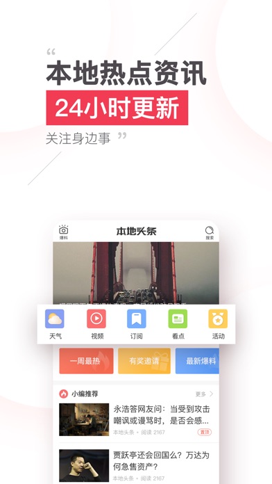 本地头条,随时随地了解身边事。 本地头条以本地为核心,发现每一座城的独特,为用户提供当地资讯、生活服务及线上线下的社交。 【全面及时的本地资讯】 24小时提供新鲜资讯,实时更新当地热点事件。本地头条是你获取当地资讯信息的平台。 【热闹火爆的当地活动】 这里有当地的公益活动,等待像你这样的热心人。这里还有各种美食、旅游活动,等你来组团。 【快捷及时的爆料功能】 随时随地上传相关事件的照片和文字,一键爆料身边新鲜事,千人爆料团等你来加入,更有红包等你领取。 【触手可及的生活服务】 天气预报,常用电话,农历黄历,查快递,汽车票,火车票,你需要的生活服务都在这里。 【就在身边的乡亲评论】 汇集了本地网友的精彩评论,不仅有高大上的资讯点评,也有对话题的热辣讨论,让自己不再成为看资讯的局外人。 【精彩纷呈的高清视频】 收录热门、搞笑、综艺视频,更有当地电视台特色节目,为您带来清晰流畅的视频观看体验。 ----联系方式---- 本地头条邮箱:kefu@benditoutiao.com 本地头条电话:4000400091 本地头条官网:http://benditoutiao.com