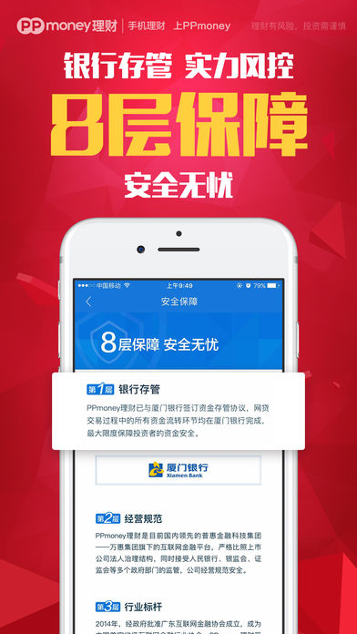 【PPmoney理财全面接入银行存管系统】 PPmoney理财率先响应监管要求,携手厦门银行,正式实现全面接入银行存管。银行存管实现了平台自有资金与用户资金完全隔离,实现了全面符合监管要求,切实保障投资人资金安全。 已上线的PPmoney理财银行存管系统,六大核心措施,严格保障用户资金安全: 1、系统分账监管 2、用户资金存管 3、银行系统密码 4、用户授权操作 5、资金流水监管 6、杜绝资金挪用 【手机理财,上PPmoney】 PPmoney理财是万惠集团旗下手机理财平台,中国互金协会首批会员单位,专注于合规运营的行业前列手机理财平台; 专注小额分散,专注风险管理;资金去向可追踪,为您看管每分钱; 专注安全运营4年,投资用户零损失; 国内首批ICP证平台,国家三级安全备案; 1200万用户信赖的理财之选! 【PPmoney理财新手专享】 新手福利!首投1%返现最高1000元可提现+ 4500元红包可抵投资本金; 额外惊喜!累计投资满150万元,赠送128G iPhone 7Plus一台; 赚上加赚!工作30天,赚出33天的工资!新手专享高息省心宝。 【PPmoney理财平台资质】 中国互联网金融协会首批会员; 中国互联网金融杰出安全风控平台; ICP许可证的互联网手机理财平台; 广东质量诚信承诺单位; 国家安全三级备案; 【平台特点】 1、风险保证,稳定运营: 风控经验丰富的专业团队,4年平稳运营,用户投资收益无损失; 2、无投资门槛,预期年化收益6%~9.5%。 百元起即可投资理财产品,预期年化收益可达6%~9.5%,1200万用户理财之选。 3、投资期限活,产品种类多: 理财期限和收益选择灵活,产品种类丰富,帮你优化资产配置; 【联系我们】 如有问题或意见,欢迎联系我们 PPmoney官网:www.ppmoney.com 客服电话:10101212 (0900-2200) 微信服务号: wanhuitourong 微信订阅号: PPmoney520