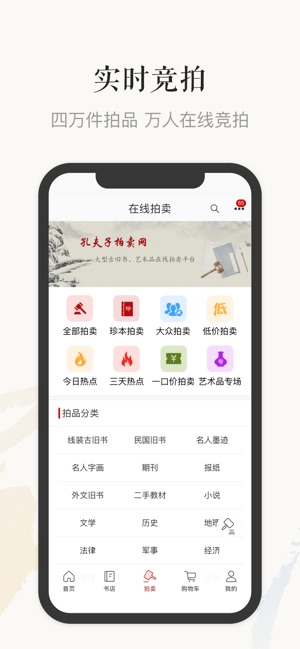 孔夫子旧书网:买您买不到的书,就上孔夫子旧书网。国内专业的古旧书籍、二手书、艺术品收藏交易拍卖平台,国内领先的中文网上图书商城。网罗天下图书,传承中华文明。 书店区:汇集全国各地的近十万个卖家,展示未售图书几千万种;海量优质特价书、折扣书、二手书,是爱书人的淘书圣地。 拍卖区:每日新增1万多种拍品,从明清古籍、民国期刊、名人信札到近期出版的新书,从字画、连环画、邮票、钱币到古玩杂项,都能够以合适的价格购得。 作为民间古旧书收藏的风向标,孔夫子旧书网为买家和卖家提供最有参考价值的古旧书拍卖数据及分析。您可以免费开书店卖书,将个人收藏的书籍或艺术品交易变现。 【经营品类】 - 图书:古旧书、二手书…