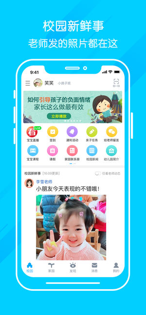 掌通家园-上千万家长首选的家园共育互动交流平台,家长可以通过掌通家园随时获知幼儿园的最新动态,和老师一对一交流,观看流畅的实时视频,真正做到家校的无缝对接。在延续“让孩子更开心,让家长更放心,让老师更用心,让园长更省心”的宗旨上,还携手更多知名品牌,为更多的家长和宝宝搭建起一个专业、贴心、丰富的学习互动交流平台。 掌通家园你首选的原因 【火】上千万家长首选,覆盖幼儿园遍布全国。 【专】知名育儿专家、机构入住,提供专业指导。 【精】携手更多知名品牌共创精品内容时代。 主要功能 【家校】记录宝宝成长,链接家庭和园所。 【社区】千万家长和教育工作者亲密接触。 【育儿】全方位满足宝宝看、听、玩、做…
