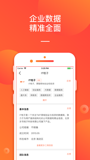 IT桔子,泛互联网行业创投信息数据库 百万创投、行研、商务人士的选择:从获取最新投融资信息,查询、联系、导出创业/公司和机构行业研究,到拓展商务等等,IT桔子为你提及时、精确的数据服务。 【10万+公司/机构信息】 公司、机构多维度立体化数据呈现 【5万+投资事件】 实时更新投融资动态,洞察创投行业新风向 【3万 +精品报告】 汇聚行业报告2w+份,全面了解行业态势 【行情趋势】 实时跟踪各行业领域热度、融资阶段分布 【行业图谱】 聚合细分领域公司,速览热门领域新兴项目 【超级小组】 创投社群,细分领域的优质信息流与话题讨论 ——升级VIP会员,功能更强大—— * 海量数据标…
