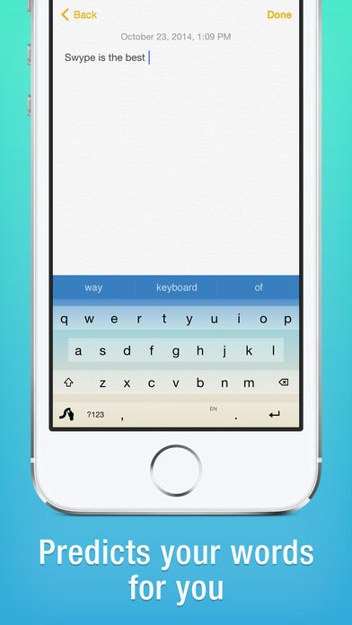 Why type when you can Swype? Swype is the most accurate keyboard on the planet. Whether you type or Swype we enable you to input words faster and easier. It learns the way you type so the more you use it, the smarter it gets. “There is no faster, easier way to input text on an iPhone” -– CNET “My favorite is Swype...It’s surprisingly powerful” – The New York Times Note: Go to the Swype App on your Home screen to preview and purchase new themes. Product Features: • Incredibly intuitive language models that accurately predict what you type or Swype • An Emoji Keyboard with hundreds of Emoji to choose from and Intelligent Emoji support • Seamless regional dialect support and trending new words • 5 Free themes and more to purchase • Quickly enter symbols, punctuation and capital letters with Swype gestures • Add or remove words from your personal dictionary • Customizable keyboard layouts (QWERTY, QWERTZ, AZERTY) • Use Swype on your iPad or iPhone Supported languages: Arabic - العربية English English (AU) English (UK) Czech - Čeština Danish - Dansk Dutch - Nederlands Farsi - فارسی Finnish - Suomi French - Français French(CA) - Français(CA) German - Deutsch Greek - Ελληνικά Hebrew Hinglish - Hinglish Hungarian - Magyar Irish - Gaeilge Italian - Italiano Norwegian - Norsk Polish - Polski Portuguese - Português Romanian - Română Russian - Pyccĸий Spanish - Español Swedish - Svenska Tagalog - Tagalog Turkish - Tϋrkçe Ukrainian - Українська Vietnamese * For best results Swype is now for iOS 9 and above.