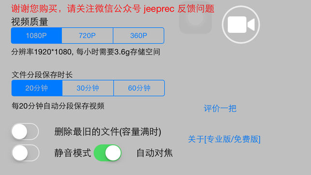 内容提要 iOS设备上最简单、实用、稳定的行车记录软件! 功能说明: ------------------------------ - 基本功能 - 行车视频录制,视频质量设置, - 自动循环录像模式,剩余空间小于200m时,自动覆盖历史最旧的一段视频, - 手动循环录像模式,剩余空间小于200m时,用户确认后再覆盖历史最旧的一段视频, - 按设置的时长10/20/30分钟,自动分割视频文件,同步到电脑不再担心大文件下载速度慢的问题, - 支持静音录制,保护行车隐私, - 支持自动聚焦, 前车的车牌清晰可辨, - 支持在iOS设备上查看视频列表、播放、保存到相册、删除, - 支持前后摄像头切换…