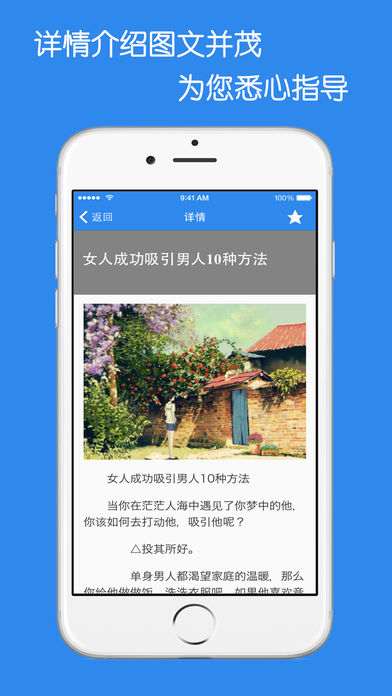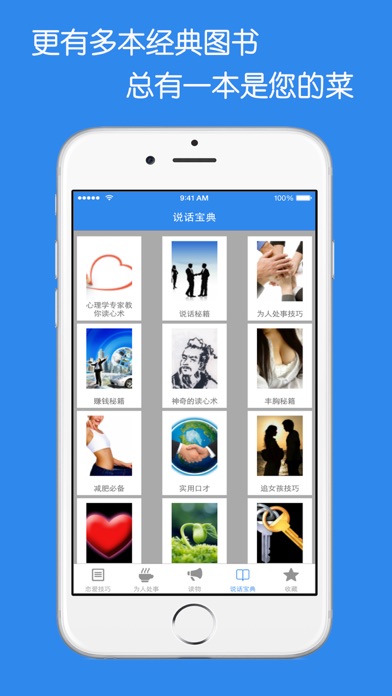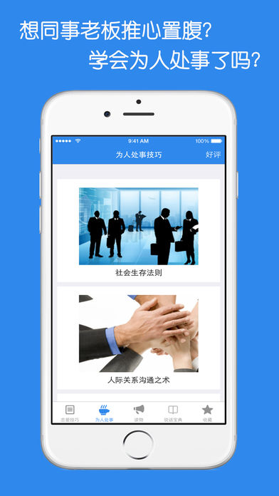 【产品简介】 提供各种场合的说话技巧,可以帮助我们掌握能说会道的方法和技巧; 多多交谈,情感保值,过犹不及,适度赞美,拒绝上司,不能硬来,学会说讨人喜欢的话,抓住人心,以诚动人。 面对女人,会说哄话,谨慎用语,避免冲撞,拒绝,求爱,讲究方式。 第一次约会如何说话,含蓄委婉,暗提缺点,委婉拒酒,妙语应酬。 人际关系一个最基本的目的就是结人情,有人缘。要像爱钱一样喜欢情意,方能左右逢源。求人帮忙是被动的,可如果别人欠了你的人情,求别人办事自然会很容易,有时甚至不用自己开口。做人做得如此风光,大多与善于结交人情,乐善好施有关。施恩术是人情关系学中最基本的策略和手段,是开发利用人际关系资源最为稳妥的灵验功夫。 【产品特点】 特点一:拥有海量的说话技巧,还有多个生活实用技巧,让你从中受益无穷 特点二:良好的分类,整齐的排版,另外有搜索功能,让你使用更加舒心 特点三:收藏功能,让你收藏喜欢的文章。