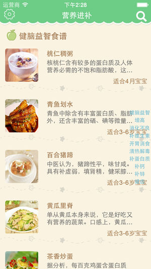^-^ 在此祝所有宝宝健康、快乐.... 宝宝有一个健康的身体,是父母最为关心的事。 从小的饮食均衡与宝宝的健康息息相关。怎样让宝宝不输在起跑线上?解决这个问题,我们从宝贝的饮食开始。 无论是新手妈妈,还是妈妈达人,相信都会为每天孩子的营养饮食而烦恼。我们全力为您解决喂养宝宝的问题,让宝宝的饮食变得科学合理,营养均衡。 【应用程序简介】 1.为妈妈们精心营养补充,健康食疗,爱心便当三类食谱,按月分类,全面满足宝宝每个时刻的需求。 2.支持食谱和食材搜索、关键字查询。 3.支持购物单菜谱收藏功能,方便您及时调出购物信息。 4.优美合理的布局界面,效率护眼。 5.信息本地储…