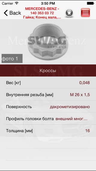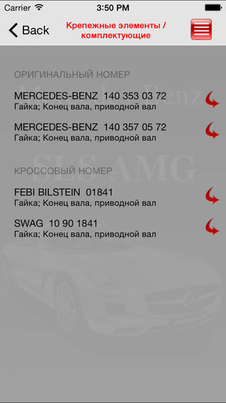 Данная программа поможет найти вам нужную деталь на ваш автомобиль. Имеется поиск по номеру. Результат поиска - фото, характеристики, кроссы (аналоги) запчасти. Каталог работает оффлайн (без интернета) . Просмотреть детали так же можно по дереву деталей выбранного автомобиля. Имеется фильтр по авто: год выпуска (с 2010), объем двигателя( 6.2 (197.377) 6.2 (197.477)) тип двигателя( Бензиновый двигатель) Результат фильтра - список авто. На странице автомобиля отображаются характеристики (Дерево деталей, вид горючего, вид катализатора, заправка горючего, код двигателя, количество клапанов на камеру, количество цилиндров, тип двигателя, тип привода, тормозная система.) Каждую деталь и авто можно добавить в избранное и посмотреть в истории просмотра.
