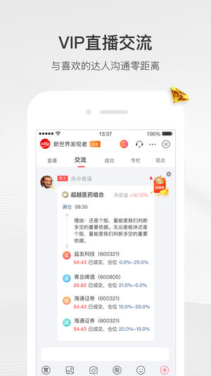 找对了顾问,做对了决策,买对了股票! --------------------------- 我们有4颗心,等您来领取!------------------------------ 【股市直播】- 专业的炒股牛人,每天盘中进行实时直播,解答当前热点,不用自己找信息,舒心! 【实盘组合】- 牛人实盘股票组合,不弄虚作假!实时调仓提醒,操作简单,跟随即可,放心! 【投研专栏】- 多种炒股战法,基本面、技术面到消息面,面面俱到,全面了解手中个股,安心! 【缠论行情】- 独家手机版缠论行情,不管身在何处,个股分析一手解决,顺心! --------------------------- 典型用户的…