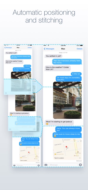 Automatically stitch your screenshots into one long image with Tailor. Ever wanted to share a conversation with a friend, but it wouldn't fit in one screenshot? With Tailor you can! Just take a few overlapping screenshots and Tailor will magically align and stitch them together for you. No more man…