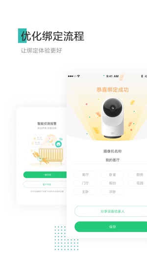 - 幸福:智能家居连接现代家庭,随时随地与家人在一起。 - 高配参数:1080P分辨率,110度广角,4倍数码变焦。 - 双向语音通话:清晰流畅的通话,能看又能说。 - 体感操作:陀螺仪全景视图,手势识别和语音控制,玩转黑科技。 守护您的家庭安全: 通过手机、电脑、Pad连接小蚁智能摄像机,看家、看孩子、看老人、看店、看宠物,随时了解家中情况,双向语音轻松沟通,让一切近在眼前。 将设备分享给亲情账号,权限自由控制。 开启智能报警,异常动态及时推送,还能绑定微信,接收报警提醒。 既智能又简单: 二维码方式快捷连接,简单绑定您的账号与摄像机;多种控制方式,页面点击、手势识别、语音控制,玩转智能…