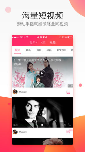 在爱听4G,电信用户省内免流量听歌看视频K歌 在爱听4G,最新最全彩铃资源,DIY您的个性化彩铃 在爱听4G,独特音乐推荐算法,为您挖掘更多好音乐 在爱听4G,体验爱听+聚合,电台、音乐、听书、短视频应有具有 在爱听4G,与爱听粉丝一起聊天交友、分享音乐,创建属于自己的私人音乐圈 核心功能 【国内唯一的免流量音乐播放器】:电信4G用户用爱听4G省内流量全免 【爱听短视频】全网海量搞笑、娱乐、音乐视频随意看,而且也是免流量的哦 【百万彩铃个性铃声DIY】:最新、最全彩铃资源,试听、订购、管理一站式服务;强大的铃声制作工具,录铃声、剪铃声、写铃声,铃声我只要DIY 【爱听+聚合】电台、音乐、听书…