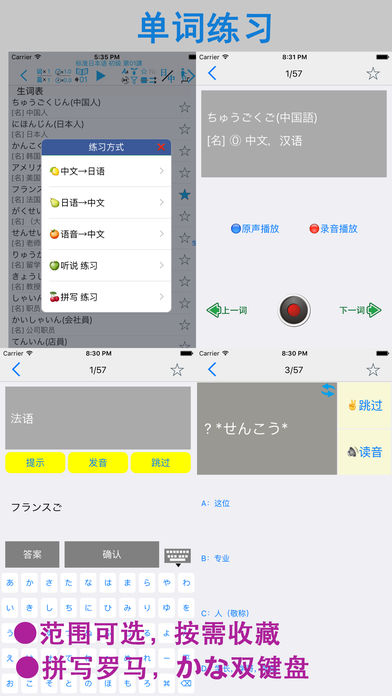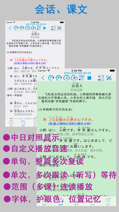 本APP参照《新版标准日本语初级》制作而成。包含了初级上下册48课的生词表,课文(会话),语法解释及部分课后练习的听力部分。全部的课文和生词都配有真人高音质发声。您可以通过手机和平板进行下载。方便任何有需要的朋友方便快捷的学习,快速强化您的听,说,读,写能力。本APP集成了超强的复读功能,可以根据自己的需要对每个单词、每句话或者整篇内容进行一遍或多遍的复读,洗脑式的复读可以加强记忆。同时,您还可以在“设置”里进行设置后台播放,方便您在移动中使用。 (注:如果您有任何购买问题咨询或意见反馈,可通过新浪微博:橙汁APP,或微信chengzhiapp 和我们取得联系) 语音复读模块: 在会话,课文和单词部分中,除了手工点击可以播放外,还集成了超强的复读功能。具体包括: ① 通过词[句]([词])按钮【左2】 调整 一句话/单词 的 单次复读次数(最大为99次)。 ② 在①的功能基础上,还可以通过[篇]按钮【左3】来调整整篇的复读次数(最大99次)。 在和①的功能组合使用的时候,一句话/一个词 最大可以复听(99x99)次。 ③ [音速]按钮【左4】用来调节发音的速度(0.5~2.0),帮助您找到适合自己的语速。逐渐的加强听力。 用来调节发音后的等待时间,(0.1~10),您可以在设置中设置适合自己的默认发声的速度。) ④ [等待]按钮【左5】置适合自己的默认发声的速度。)使用该功能可以方便您进行听写和跟随朗读。同时该功能也配合[句,词]功能进行多次跟读。 (您可以在设置中设置等待时间的单位(单词发音长度单位或时间秒单位)。) ⑤[范围]按钮【左6】用来调节复读的范围,通过该功能可以实现多课连续朗读。该功能可和上述①、②、③的功能同时使用,让您最大限度的使用复读功能。连课范围是:进入的课开始,选择的连课结束。例如:复读3-16课:第3课进入,选择16,点击播放即可。 ⑥ 如果在设置中打开后台播放功能(默认打开),就可以让您设置的复读声音进行后台播放。您可以通过耳机的线控进行停止/继续,在有在连课的时候,更能通过线控进行切课。(单击2次换下一课,单击3次换前一课,单击一次播放/暂停。) ⑦ 按钮 [▶]/[■]【左7】进入复读开始/停止。 基本(文型,例文),课文,会话: ①为方便初学者,本APP为文章中的每个汉字加上了注音,您可以通过[ひらかな]按钮进行显示或隐藏的切换。 ② 显示切换:您根据自己的需求,通过工具栏上的[中/日/中日]的按钮进行中文或日文的显示/隐藏的切换。 单词部分: ① 显示切换:您根据自己的需求,通过工具栏上的[中/日/中日]的按钮进行中文或日文的显示/隐藏的切换。 ② 收藏模块:您可以通过每个单词右边的[星号]按钮,对单词进行收藏。并通过顶部的[星号]按钮,对收藏的单词进行过滤显示。 ③序号显示:可通序号显示按钮进行序号显示临时切换。 ④分列显示:更改屏幕的单词显示方式(上下显示,左右显示)。 ⑤乱序显示:更改屏幕单词的显示顺序。(支持复读) ⑥单词过滤:通过过滤按钮可以进行显示范围的调整。 ⑦练习模块:通过顶部的[练习]按钮,您可以切换到单词的练习模块。本APP集成了“中文->日文”、”日文->中文“、”中文->语音”,“听说比对” ,“单词拼写”等(以下)五个练习模块。(※ 1,※ 2,※ 3) a. “中文->日文”练习:根据中文内容选择相应的日文。 b. “日文->中文”练习:根据日文内容选择相应的中文。 c. “语音->中文”练习:根据听到的声音选择相应的中文。 d. “听说比对” 练习:通过录音,及回放比对您的发音和标准发音。 e. “单词拼写” 练习:通过提示的中文,通过键盘(kana或罗马字)拼写出假名。 ※1 练习模块可和收藏模块进行配合时,可对自己选定(收藏)的单词进行练习。 ※2 练习模块可和范围模块进行配合时,可对特定范围进行练习(例如:第一课进去,选择连课16课的时候,练习范围就是1-16课的单词)。 ※3 练习模块可同时配合收藏,连课2个模块一起使用。 语法解释: 收纳了课本中的语法解释部分的所有语法及例句。 听力练习: 对每课,课后练习的听力部分进行整理(问题部分含听力答案),方便您系统的学习后,对所学内容的巩固。 五十音图: 包含了日文字母,清音,浊音,拗音的平假名 ,片假名,罗马字及其相对性的发音。 其他: ◎你可以通过左右滑动进行切换课(向左滑动上一课,向右滑动 下一课)(※5) ◎在设置中您可以设定使用后台播放(默认) ◎在设置中您可以设定默认的语音速度 ◎在设置中您可以设定后台播放时定时关闭的时间 ◎在文法界面,右上角有一键打开全部文法的按钮 ※5 会话,单词的滑动范围:上一课是选定的课,下一课是最后一课。文法的范围是(1~最后课) 本APP采用iphone,ipad的双版本设计,一次购买,可在iphone,ipad上同时使用。 APP 中的大量内容,是作者手工录入的,如果您发现不对的地方,望在APP里的意见反馈中联系我们,我们会在定期的版本更新中,修正您提出的问题。谢谢。 如果您喜欢这款app,请赠予评价,将是对我最大的鼓励,您的好评会让我更有动力将这款app做到最简洁,最方便,最实用!! 注1:本APP不含有内购和广告。 注2:本APP不是电子版的教科书,是一款配合教科书的学习用的APP,我们侧重了学习语言最重要的2个部分-听力及其单词记忆,为此我们开发了这款带有超强复读的APP,并对单词部分提供多种练习。 注3:如需想对APP进行功能试用,请下载,大家的日语体验或标