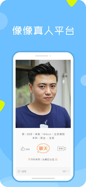小视频相亲大会火热进行中! 像像是以“真人真头像”为特色的交友聊天软件,真人交友,真人聊天,个个都是本人照! 主要功能: 1、像像用户的头像都是本人真实照片,都经过严格的真人认证! 2、可以免费参加小视频相亲大会,交友成功率更高! 3、双方互加像友后可以用文字、语音、图片免费聊天! 4、像友之间还可以一对一视频聊天,沟通更亲切! 5、可以通过动态功能随时分享新鲜有趣的事,还可以相互点赞和评论。 6、开启定位后,可以随时和附近的人互动聊天。