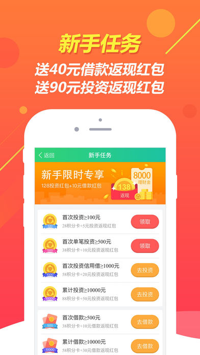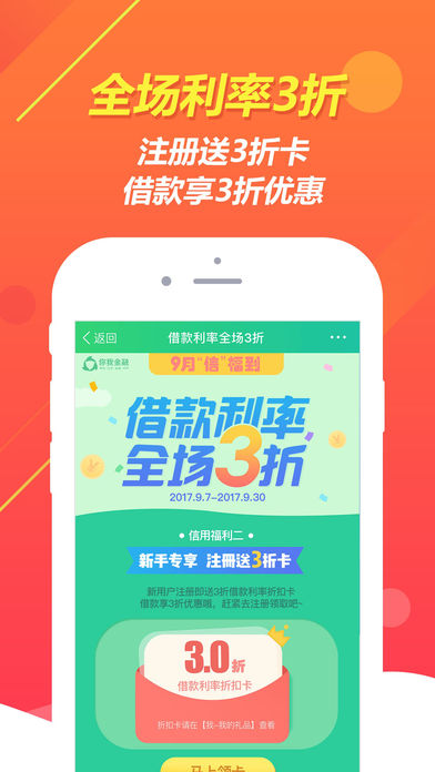 借款+理财一账通,注册即送8000理财金+10元借款红包+128元投资红包+抽奖卡2张 【平台新活动】 -9月“信”福到,借款利率全场3折! -理财狂欢月,全民返现,一次性返2.3%,现金奖励无上限。 -你我金融招募令,王牌兼职,月赚千元,邀友返现上不封顶。 【借款优势】 1. 方便:借款8000元,仅需芝麻分 2. 极速:1分钟申请,快至10分钟到账 3. 简单:0抵押,仅需手机即可借款 4. 省心:日息不足万3,信用越好利率越低 【投资优势】 1. 门槛低:1元起投,闲钱轻松理财 2. 好收益:往期年化收益10%-14% 3. 更灵活:7天-6个月任选,灵活理财 4. 更智能: 自动投资+批量投资,轻松赚收益 【平台特色】 - 信用定价: 信用越好,利率越低,并享受更多优惠福利 - 真实透明: 标的小额分散,详情100%透明,随时可查 - 还款方式多样:一次性本息、等额本息多种方式,资金更灵活 【公司简介】 深圳市你我金融信息服务股份有限公司(简称你我金融)成立于2014年8月,公司旗下开发的APP”你我金融 - 让你的信用更有价值“是一款移动社交金融APP,基于移动互联网及民间借贷快速发展的无限前景而创建的,致力于向社会大众提供一个人人皆可参与、透明的普惠金融平台。 【联系我们】 客服电话:400-0683-666(七天无休:9:00-18:00) 想了解更多福利~请关注你我金融微信公众号“NIIWOO”