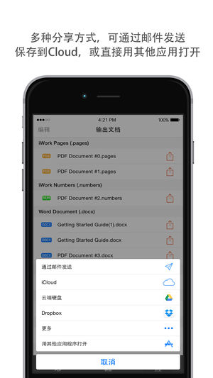 快速将PDF文档转换成Office, iWork等文档格式,让您在Office或者iWork应用中轻松编辑和利用PDF的内容。 一旦安装完成,PDF Converter 就会出现在‘打开…’列表中,您可以从邮件或者其他应用中导入PDF源文件。也可以从iCloud Drive或者其他云端存储服务中导入PDF文件。只需要3部就能完成文档转换:添加文档,选择输出格式,点击’转换’按钮,就是这么简单。转换完成之后,您就可以直接用Word或者Pages等应用打开文件,或者存储到iCloud Drive或者dropbox, google drive等,或者作为附件通过电子邮件传输。 主要功能: * 轻…