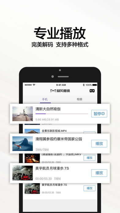 暴风魔镜VR-拥有海量VR电影、全景视频和3D游戏的高清VR内容平台。一键进入沉浸世界,犹如身临其境,全心感受沉浸式视频和炫酷VR游戏惊险刺激的无限魅力。暴风魔镜VR 3D高清内容平台,尊享超越IMAX影院的震撼体验! 【主流设备适配,专业兼容】 适配大部分虚拟现实设备,放心观影,不怕拉伸变形,杜绝色差重影。看电影时默认锁屏状态,躺着坐着都不怕。同时配有多个场景,电影院,温馨客厅想在哪看就在哪看! 【本地播放,功能强劲】 本机自动扫描,飞屏连接电脑,多种渠道获取资源。智能识别视频类型,支持各种模式的视频(全景,全景3D,2D,3D)/图片,结合暴风影音强劲的播放能力,稳定流畅,让您愉快享受观影过程! 【沉浸世界,一键开启】 一键”进入VR“,温暖的家庭场景,3D真实的立体效果。 头控交互与全景浸入式体验,magic UI带您真正身临其境,体验虚拟现实的奇妙世界!
