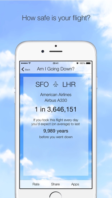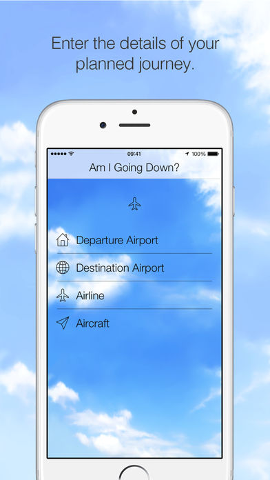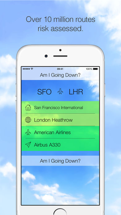“Am I Going Down?” is a flight risk calculator designed to help those with a fear of flying. After entering your journey details, “Am I Going Down?” provides the likelihood of your flight going down. How safe is your next flight? Crashes may make the headlines, but they’re incredibly rare, and when they do happen, seldom lead to injury. With those facts, there’s no need for nervous flyers to fall back on anything but cold hard numbers. “Am I Going Down?” will tell you how and why you have only a millions-to-one chance of crashing, allowing you to fight fear with information. Next time you want to fly, don’t take sleeping pills or a soft toy - take the truth. CNN “New app Am I Going Down? uses aviation statistics to analyze the odds a flight will crash.” Mashable “A new iOS app that uses big data to help alleviate the fears of anxious travelers” Daily Mail 'Am I Going Down?' app uses real flight statistics to analyse flight safety. Also featured in: The Economist, Huffington Post, Quartz, Bustle, Gizmodo, Business Insider, Daily Telegraph, Gadget Show, and many more! — Disclaimer: While Am I Going Down is based on published flight and crash statistics to give an indication of flight safety, the app is intended for entertainment purposes only. The odds presented are an estimate of historical risk and not a prediction of future performance. If you have any questions please contact info@vanillapixel.com or follow @vanillapixel on Twitter.