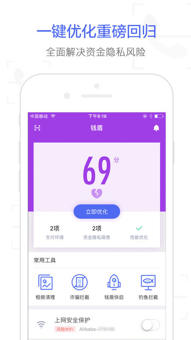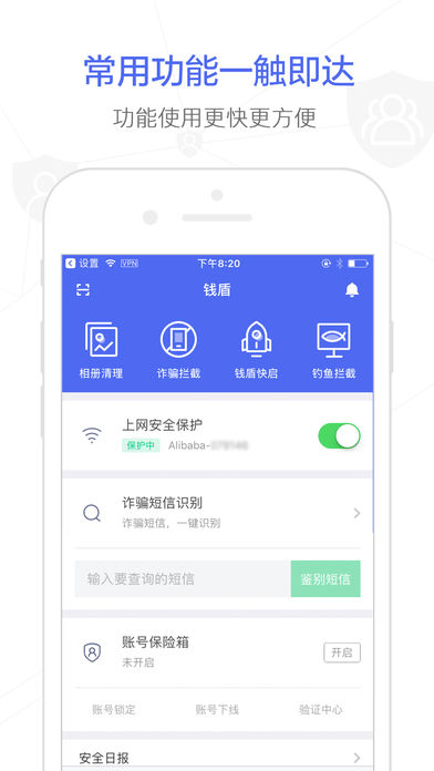 国务院联席办与阿里巴巴集团联合推出的资金安全品牌:钱盾 - 手机保险箱 全民防垃圾短信骚扰:强大的垃圾短信识别引擎,iOS11及以上的用户再不担心诈骗、垃圾、广告等短信扰乱生活 钱盾保险箱:资金保护体系,一次解决你的资金安全隐患 全民防骗:拥有全面的电信诈骗号码库,全面识别、拦截诈骗电话 全民举报:一次有效举报,可帮至少10人防骗 防范预警:各地公安入驻,提醒解密新骗术 智能WiFi加密通道:实时拦截欺诈钓鱼,实时保护上网安全 安全支付赔付保障:全面保护你名下所有的银行卡、支付宝以及淘宝账户的资金安全!最低3.88元就可以享受一年高达120万的赔付额,其中包括最高100万的支付宝账号险,和最高20万的银行卡资金安全险。 全链路资金保护体系:高准入、全链路……一次解决你的账户被盗、交易风险提示、保障支付安全等一系列资金安全隐患! 三大安全能力,打造最坚固的手机保险箱:账户防护;支付保障;诈骗拦截。 最新推出日历防诈骗功能,通过海量用户的数据反馈以及大数据的智能分析,帮助用户检测并清除日历和提醒事项中的诈骗信息。用户仅需在钱盾APP内轻轻一点,秒杀日历诈骗广告。 钱盾还为您提供以下贴心功能: 1. 照片清理:为您清理相似照片、无用截图、滤镜原始照片,同时还能筛选连拍! 2. 钱盾快启:通知中心一键快捷启动指定应用页面,方便快捷! 针对卖家朋友,我们额外提供: 1. 极速开店认证:帮助你更快的开通自己的小店,通过钱盾开店还可以领取免费卖家大礼包; 2. 卖家安全保护:风险异常提醒,风险消息实时推送、异常操作核实确认、风险自助处理; 3. 卖家账号/子账号管理:轻快有效的管理; 4. 店铺安全画像:随时随地掌控你的店铺安全状态; 5. 商家必读:定期更新针对卖家的安全资讯; 我们希望它能够帮助你在网购和生活中远离骗术、骚扰和损失。 为了你的需求,钱盾会做得更好,我们期盼听到你的声音,详情请查看应用“发现更多”->“顾问团用户”。 钱有盾,盗无门。 =========联系方式======== 官方微信:MoneyShield 旺旺交流群:1417482916