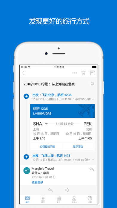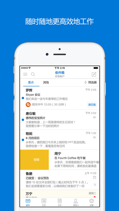 “最适合 iPhone 的电子邮件应用。”- The Verge 快来体验 iOS 版 Outlook,这个应用可帮助数百万用户在一个便利位置连接其所有电子邮件帐户、日历和文件。iOS 版 Outlook 经过重新设计,让你能够从一个功能强大的收件箱执行更多操作。 想要先查看最重要的邮件就到“重点”收件箱,该收件箱将重要邮件放在最上方。点击几下就可以在电子邮件和日历之间进行切换,方便你安排下一个会议或共享你的空闲时间。你也可以从文件列表中选择一个文档,再将其无缝附加到电子邮件中。 点击一下就可以访问你需要的所有内容,管理日常繁忙事务比以往更轻松。 iOS 版 Outlook 可与 Microsoft Exchange、Office 365、Outlook.com(包括 Hotmail 和 MSN)、Gmail、Yahoo Mail 和 iCloud 搭配使用。 -- iOS 版 Outlook 的功能: 无缝的收件箱管理 - “重点”收件箱会将你最重要的邮件显示在最上方。你使用它越多,它就越智能。 - 使用轻扫手势快速安排、删除和存档邮件。 - 智能筛选器可帮助你整理收件箱。 轻松访问日历和文件 - 点击一下即可分享你的会议空闲时间,并可轻松查找与其他人开会的时间。 - 无需将文件下载到手机,你可以从电子邮件、OneDrive、Dropbox 等查看和附加任何文件。 随时随地完成工作 - 打开 Word、Excel 或其他 Office 文档附件可直接在相对应的应用中编辑,然后再将它们附加回电子邮件。 - 直接从 iPhone 或 iPad 设置“外出”消息。 - 完整支持 iOS 9 中的 Split View 功能,方便你在 iPad 上无缝处理多任务。 -- 喜欢 Outlook 吗? 请尝试其他出色的 iOS 版 Microsoft 应用:Word、Excel、PowerPoint、OneNote、OneDrive、Skype 和 Wunderlist。