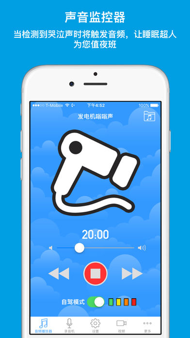***限时折扣***睡眠超人 可以帮助您的宝贝儿一觉睡到天亮。这是一个噪音- 激活应用程序,将为您的宝宝播放舒缓的声音,帮助他们返回睡眠中。除了内置的白噪声音,父母们也可以录制自己的声音,读书或唱摇篮曲,以在夜间安抚他们的小宝贝儿。 睡眠超人的创始人是一位父亲,他有一个三岁和一岁的孩子,并同运营一间应用程序开发公司。本应用程序是专为新生儿至3岁以上的宝宝们制作的,它兼容了一些特定功能,为宝宝培育一个良好的夜间睡眠环境: 0-1岁:白噪音可模拟母亲子宫里的声音,并为新生儿提供一个舒适的环境。 1-2岁:喜欢父母令人放心的声音,因此自己录制一些催眠曲和故事。 3岁以上:为年龄较大的孩子设置的内置贴纸奖励制度,这个年纪孩子难以通过声音安抚。 功能包括: 白噪声的音频库,包括40种舒缓的声音。 使用录音机录制自己的声音,摇篮曲和睡前故事。 循环播放睡眠计时器。 自动模式显示器:侦听哭泣声,并自动播放舒缓的声音帮助宝宝返回睡眠中。 可调节的噪音激活灵敏度。 柔和淡入/淡出。 贴纸图表奖励年龄较大的宝宝。 连接至智能手机的投影机,应用程序将会在天花板上播放影像,帮助宝宝安心睡眠(查看我们的博客,了解更多信息)。 优化,延长电池寿命。 防眩光设计,适合夜间使用。 采用最新的iOS技术构建。 白噪音包括: 飞机客舱 - 鸟鸣声 - 咖啡厅喋喋不休 - 篝火 - 蟋蟀 - 黑暗面 - 滴水水龙头 - 电风扇 - 长笛 - 喷泉 - 电冰箱 - 青蛙 - 水壶 - 发电机嗡嗡声 - 电吹风 - 心跳 - 山涧溪流 - 海洋 - 猫头鹰 - 钢琴 - 打呼噜的猫 - 雨 - 雨打落在车顶上 - 嘘 - 空间静态- 自动喷水灭火 - 飞船 - 喷火 - 潜水艇 - 雷 - 交通 - 火车 - 打字机 - 吸尘器 - 洗衣机 - 海浪 - 鲸鱼 - 白噪声 - 风铃 - 随风摆动的树 该应用程序经过一群热心家长的测试,通过他们的反馈帮助塑造出今天你们所看到的功能。因此欢迎家长们的积极反馈,您们的反馈可帮助开发新的功能,帮助您和您的宝贝儿们享受更好的睡眠。 我们建议您在使用睡眠超人时,开启飞行模式。