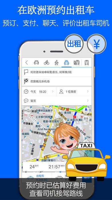离线/在线2D/3D地图;离线/在线搜索引擎;带实时路况的导航;官方中文地铁线路图;火车、地铁、公交和电车综合路径计算;在欧洲预约出租车。 离线/在线2D/3D地图:200个国家、1000万条街道、1亿个地点;3D地标、3D建筑、3D树木;地图上显示步吧、动态及出租车。 离线/在线搜索引擎:搜索城市、地址、地点、周边餐厅、周边商铺(如星巴克)等等。 带实时路况的离线汽车导航:带实时路况的2D/3D专业汽车导航;固定、移动雷达限速提示;显示交通标识和车道信息;3D路口实景图。 离线步行导航:指南针模式下,在带有3D城市和3D地标的地图上,可以更容易找路。 离线骑行导航:骑行路径计算。 离线中文地铁线路图:规划地铁导航最佳路线;在地下无网的情况下仍可正常运行,并且使用的是官方的地铁线路颜色。 火车、地铁、公交和电车综合路径计算:全部为离线情况下计算路径,并可根据不同的公共交通选项规划路线,且可以显示途经的每一条线路和站名。 在欧洲预约出租车:预约、支付、聊天、评论出租车司机;前往机场和火车站的最佳方式;预约时已估算好费用;查看司机接驾路线。
