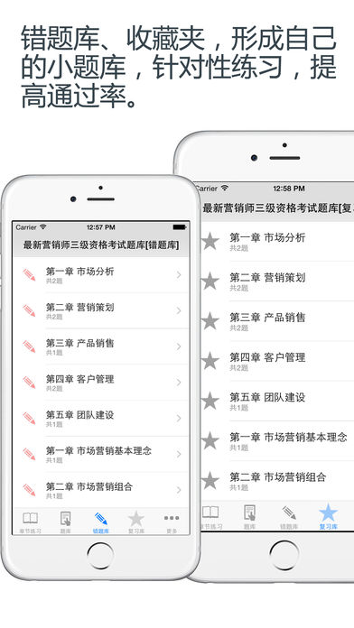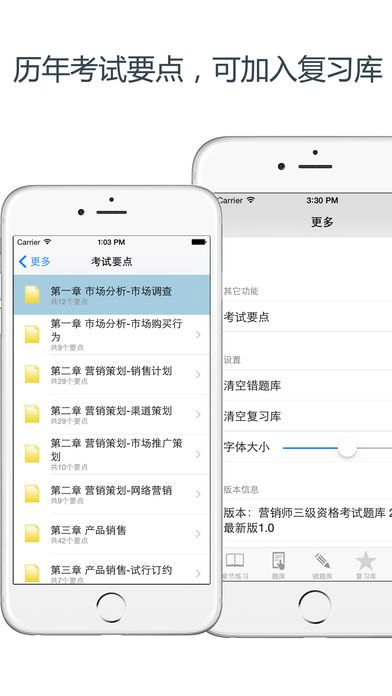 本软件为营销师三级资格考试题库的软件,精心准备了2015年最新考试模拟题库和历年考试要点(共计2000道)。为考试的提供了充分的复习准备,可随时随地学习练习,有效帮助顺利通过考试,学习知识通过考试必备神器! 【功能介绍】 1、章节练习:针对章节的习题进行强化练习,可选择不同题型,并可手动将易错或未牢固掌握的题加入复习库和错题库,以便反复练习。 2、随机模拟测试:随机生成试题模拟测试,检验复习成果,可自动将错题加入到错题库。 3、历年考试要点:提供最新历年考试要点,可加入收藏便于记忆。 4、错题库:可自动加练习过程中错题加入收藏,以便反复练习。 5、收藏夹:可在练习过程中自行收录题目到收藏夹,形成自己的小题库,针对性练习,提高通过率。 6、安装后可离线浏览,不用联网也可以浏览,速度快,无广告、无插件。 7、可设置答题时界面的字体大小。 8、支持同时在iPad/iphone/itouch等多种设备中安装。 9、定期更新题库。