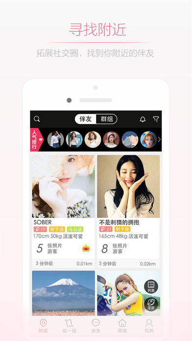 伴游是一款基于地理位置的移动社交软件。无论你身处何地,需伴游的你,可以轻松找到陪你游玩的人。如果你是一名伴游,即可丰富你的生活,又能找到兴趣相投的小伙伴。偷偷看下身边的陌生人,查看她们的伴游信息。成为伴游VIP会员,享受会员漫游功能等。加入伴游,马上进行一次神秘又浪漫的旅行吧。