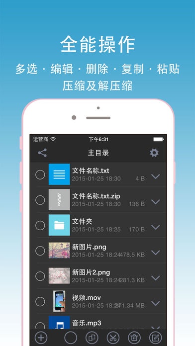 最好用的图片视频文件管理专家,保护您的隐私照片视频,支持rmvb、mp4、mkv等各种格式视频播放功能,批量管理照片和视频,简单实用的用户界面,是iPhone装机必备工具。 主要功能: *在WIFI环境下,可以通过浏览器上传下载档案在应用中的档案,让你的手机瞬间成为一个无线硬盘。可以为浏览器访问设置密码以保护隐私 *和其他安装应用的苹果设备通过蓝牙交换档案,包括相册中的照片。 *将文件上传/下载到iCloud *快速预览多种不同类型的档案(音乐,视频,档案,PDF,图像) *可以将档案在其它支持的App中打开,反之亦然 *支持各种档案操作,如创建/删除/移动/重命名等 *支持多种格式档案压缩/解压缩(rar、zip、7z等),并可以将档案压缩后通过邮件发送 *可以设定密码保护对App的访问 √支持档案iTunes快速上传下载 √支持简洁迅捷的WiFi传输 √支持从手机相册批量导入照片和视频 √支持应用内部拍摄照片 √支持设备间蓝牙传输文件 安全隐私: -支持开启手机指纹锁保护 -支持密码保护,临时切换应用到后台自动显示密码界面,保护个人隐私 中文优化: -完美支持中文文件名、文件属性的解压缩、加密解压缩功能,包括ZIP、RAR、7z等格式,有效的避免出现异常中文乱码情况。 我们注重每一位客户的使用体验,但我们无法根据您的评论来回复您。若有任何使用上的问题与建议,请您随时通过我们的客服邮箱AppDev365@gmail.com与我们联系,我们将尽最大的努力为您提供服务。