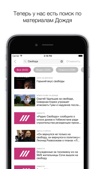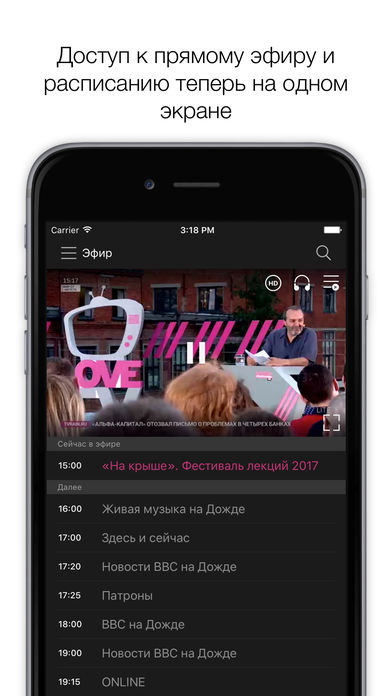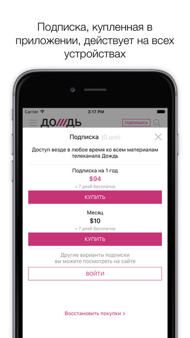 Смотрите прямой эфир телеканала Дождь, все выпуски программ, а также следите за последними новостями в приложении телеканала Дождь. Политические новости, новости бизнеса, культуры, науки, аналитика, интервью с ньюсмейкерами, определяющими повестку дня – все это вы найдете в приложении телеканала. Опции, доступные в приложении • Уведомления о важных новостях • Поиск по всем материалам Дождя • Фотогалереи • Возможность скачивания видео для просмотра в офлайне • Привязка аккаунта на смарт-телевизорах • Активация подарочного кода • Лента новостей • Прямой эфир в видео и аудио вариантах • Авторские программы Ксении Собчак, Натальи Синдеевой, Павла Лобкова и других наших авторов в видео и аудио вариантах • Журналистские расследования, видео и фото репортажи • Поддержка трансляции на телевизоры с помощью AirPlay Приложение доступно к скачиванию бесплатно, для доступа к прямому эфиру и некоторым авторским программам в архиве необходима подписка. Вы можете* получить доступ ко всему контенту бесплатно на 7 дней, и после этого принять решение о подписке. Подписка, приобретенная в приложении, дает доступ к материалам телеканала Дождь на всех устройствах – в других приложениях, на смарт-телевизорах и на сайте. После оплаты не забудьте зарегистрироваться, чтобы доступ стал возможен на всех платформах. Стоимость подписки 1 месяц полного доступа ко всему контенту на всех устройствах – 459 рублей 1 год полного доступа ко всему контенту на всех устройствах – 4790 рублей Подписка будет автоматически продлеваться по истечению оплаты. Деньги будут сниматься с вашего аккаунта в Itunes, с карты, привязанной к нему. Если вы хотите отказаться от подписки, сделать это можно всегда в настройках учетной записи Apple ID в Itunes. Телефон нашей службы поддержки +7 (495) 744-03-83. Техподдержка работает по будним дням с 12 до 21 часов по московскому времени. В остальное время вы можете писать нам по электронной почте на web@tvrain.ru *Предложение о промоподписке действительно один раз для каждого пользователя Сайт телеканала Дождь http://tvrain.ru Ссылка на офферту https://tvrain.ru/oferta/